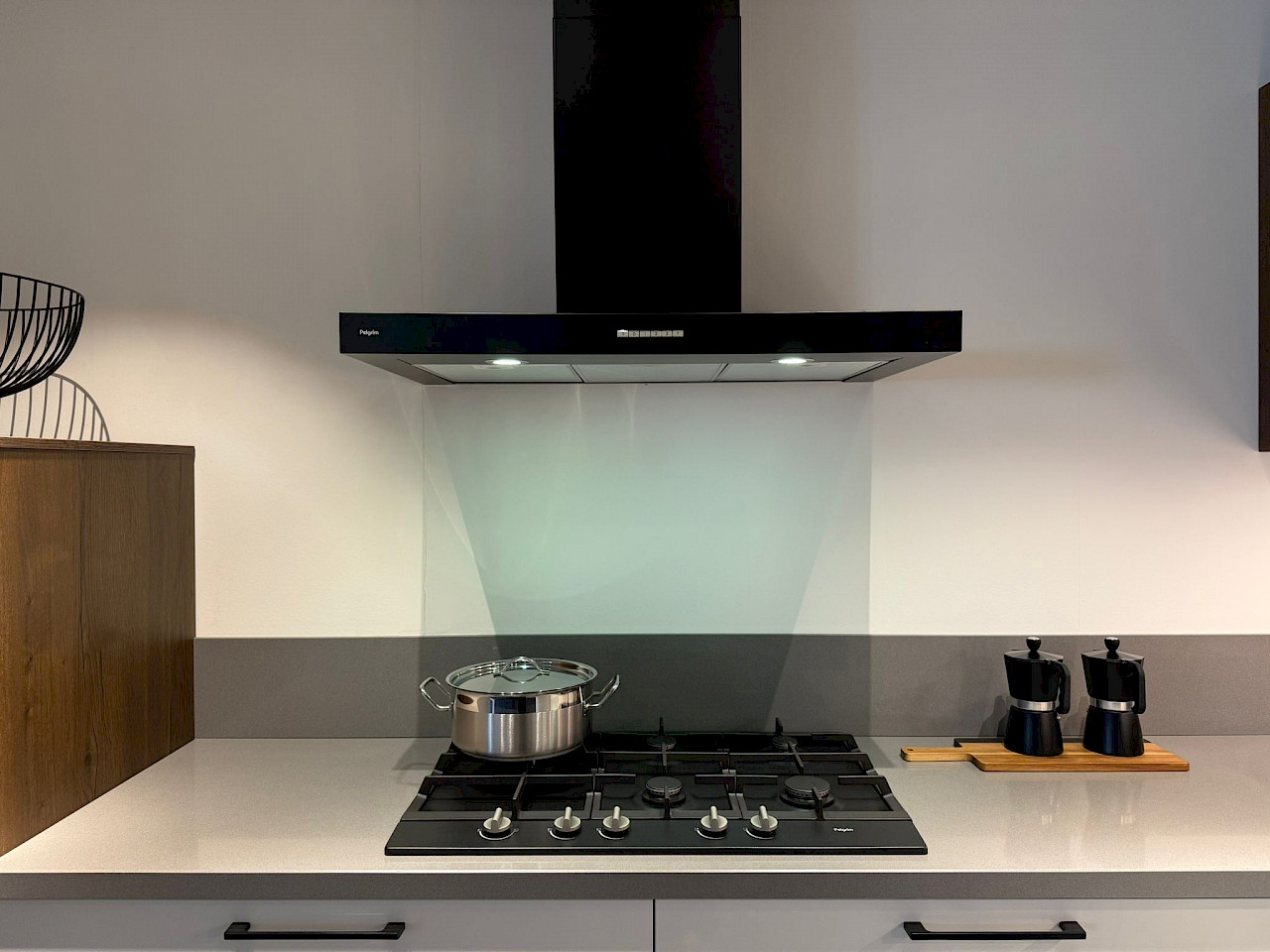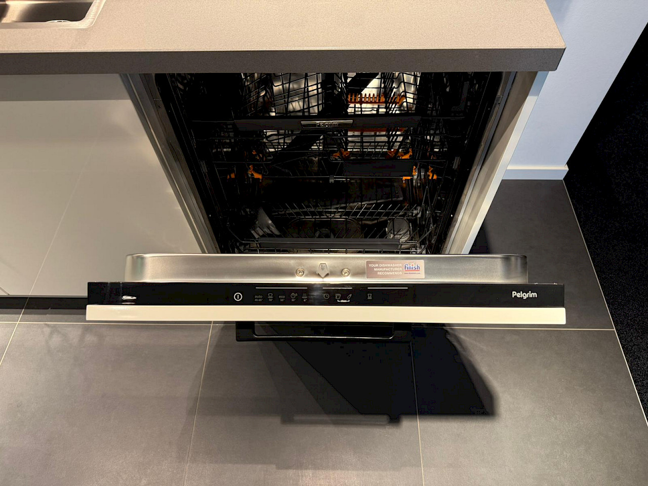 Apparatuur: Pelgrim koelkast, multifunctionele oven met magnetronfunctie, afzuigkap, gaskookplaat en vaatwasser
