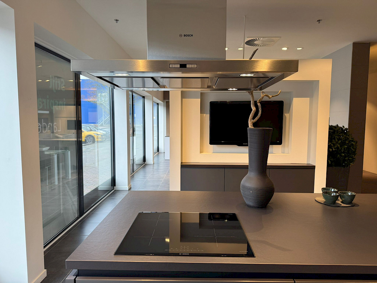 Inclusief: Bosch eilandafzuigkap, Bosch koelkast, Bosch inductiekookplaat, Bosch vaatwasmachine, 2x Bosch oven