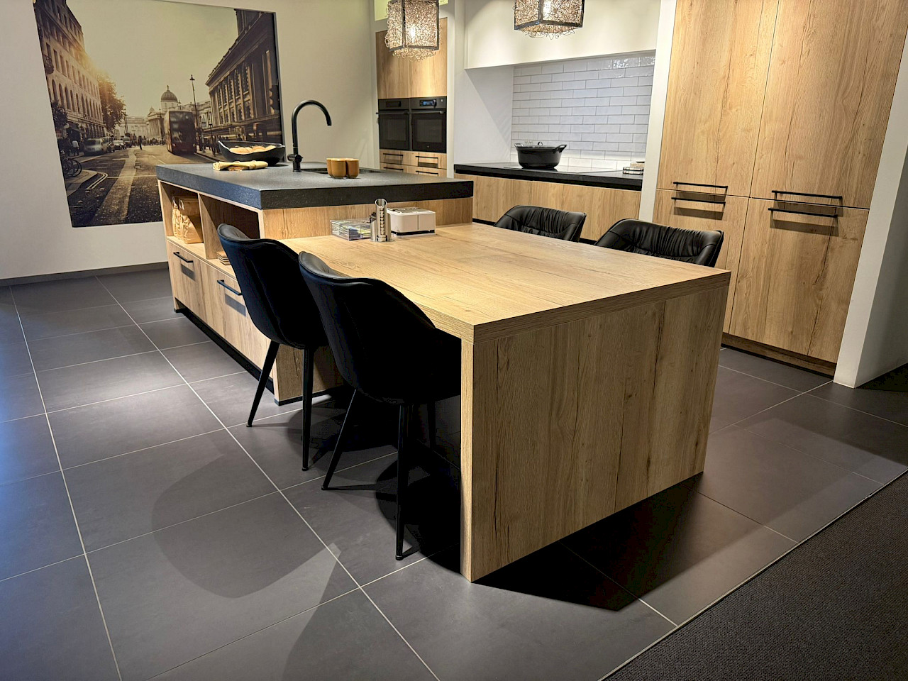 Afmetingen: Links 120 cm, midden 200 cm, rechts 120 cm, eiland 191 x 110 cm, tafel 110 x 145 cm