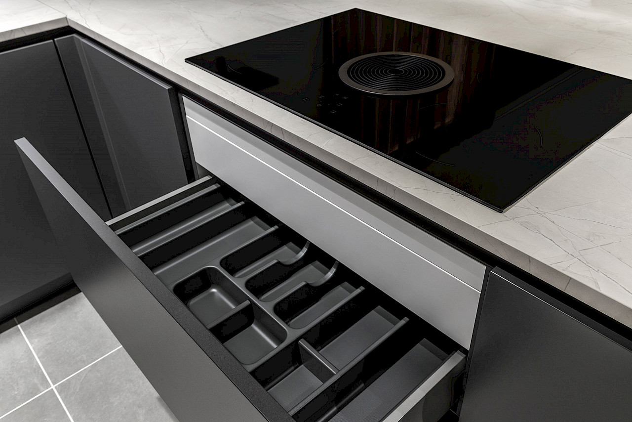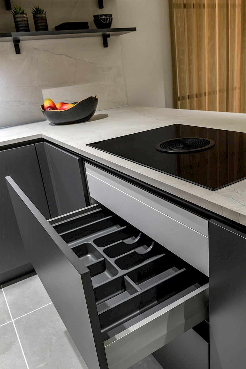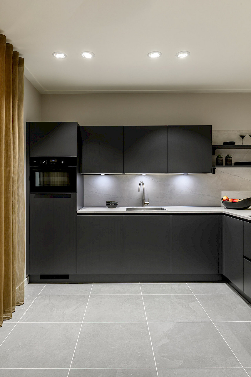 Inclusief: AEG koelkast, AEG vaatwasmachine, AEG oven met magnetronfunctie, Bora inductiekookplaat, LED verlichtingsset Lux